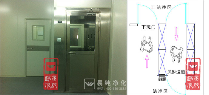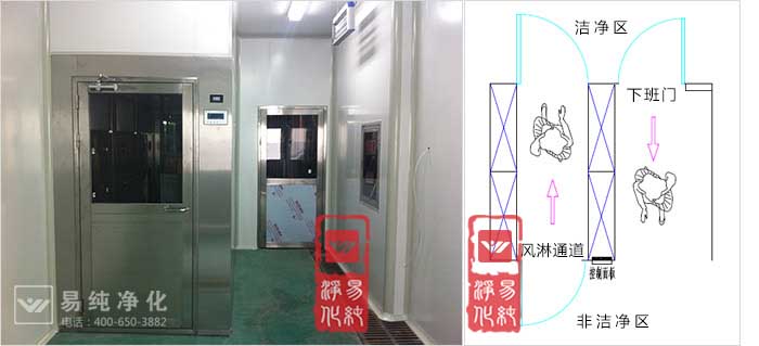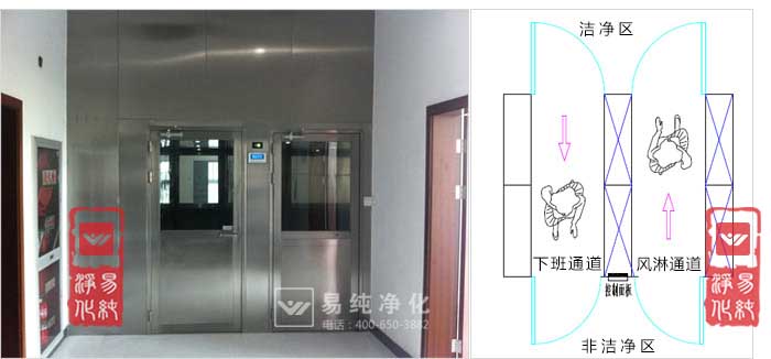 上圖即為下班通道和風淋并排安裝,左為下班通道,右為進入風淋室;