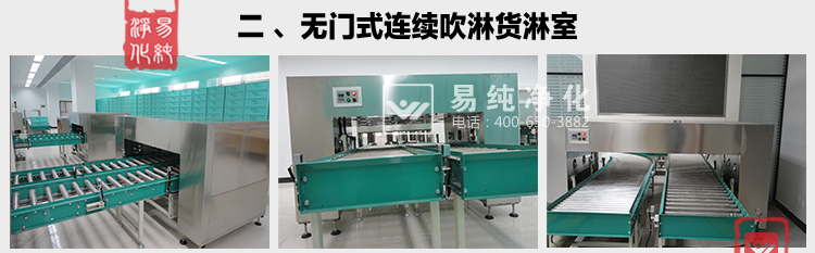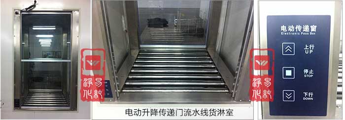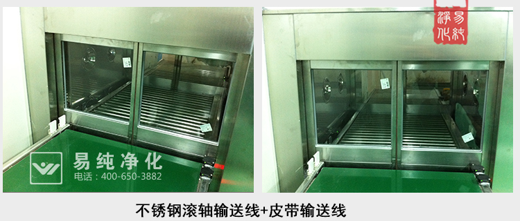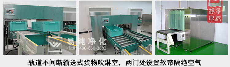 3、電動(dòng)升降門貨淋室(門為電動(dòng)控制上下升降),流水線被截?cái)喑扇糠?,分別為潔凈區(qū)外,貨淋室內(nèi),潔凈區(qū)內(nèi);