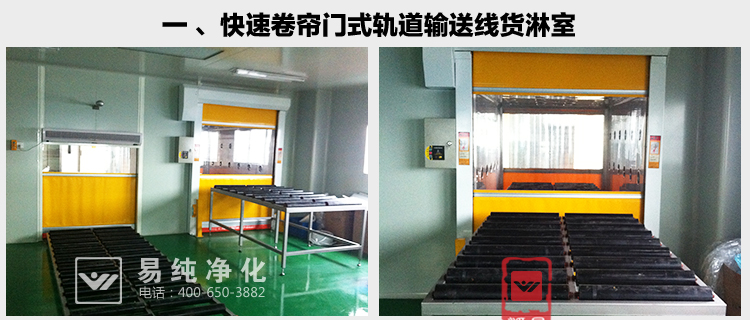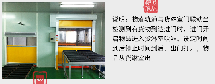 4、快速卷簾門流水線貨淋室(自動(dòng)感應(yīng)控制快速卷簾門),流水線可做成整體一條線,門下降時(shí)接近流水線,也可將流水線分成三部分;