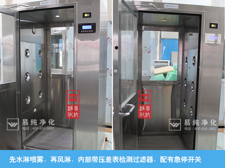 水淋風(fēng)淋一體機(jī)工作流程:1、人員進(jìn)入,感應(yīng)啟動噴霧水淋,時(shí)間可調(diào);2、水淋吹完進(jìn)入等待緩沖時(shí)間,時(shí)間可調(diào)味;3、緩沖時(shí)間到后開始啟動風(fēng)淋,風(fēng)淋時(shí)間可調(diào);在水淋和噴淋過程中,雙門全程聯(lián)鎖無法打開,保證人員進(jìn)行強(qiáng)制吹淋。同時(shí)為防止突發(fā)情況發(fā)生下人員緊急逃生,水淋機(jī)內(nèi)部設(shè)置了急停按鈕,可用于人員緊急逃生之用